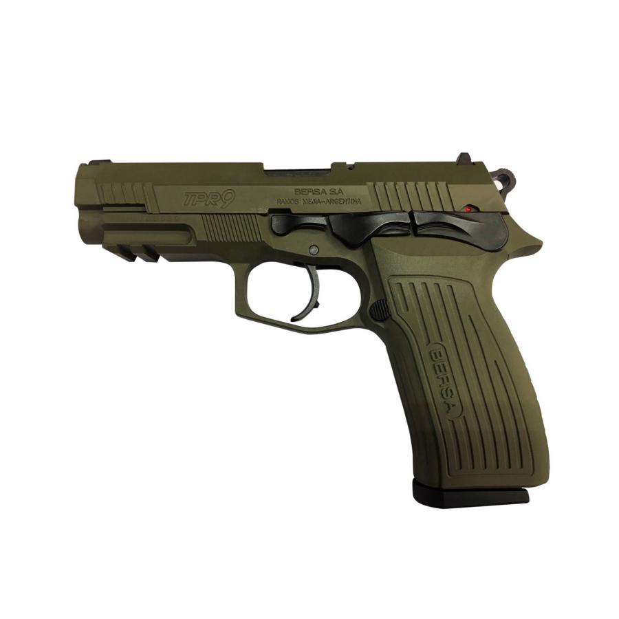 Pistola Bersa TPR9 cal 9mm nuevo diseño de corredera frame reforzado verde con grip lateral capacidad de 17+1 , incluye 2 cargadores, señalador de bala en recamara, seguros y comandos ambidiestros, riel picatinny, doble fresado en corredera, cachas anatomicas antideslizante, incluye estuche rigido tipo maletin