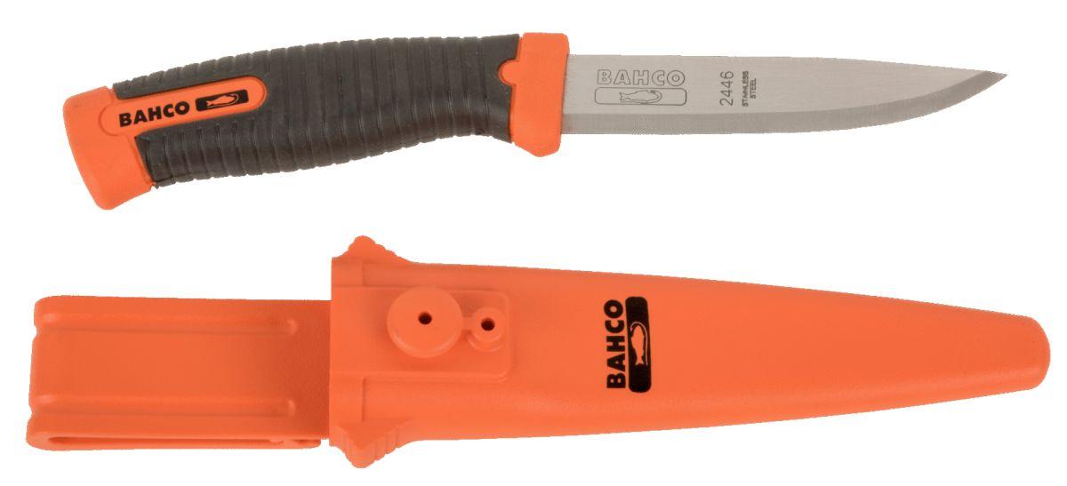 Cuchillo robusto con una hoja de acero inoxidable resistente. Cómodo mango bi-componente que proporciona un excelente agarre. Incluye una práctica funda especial con doble botón para llevarlos en el cinturón. Hoja de 100 mm de longitud. El cuchillo tiene una longitud total de 220 mm y su peso de 120 gramos.