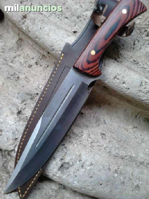 Cuchillo de monte Muela modelo jabali 21-E , acero molibdeno vanadio, mango madera estamina coral todo una pieza enterizo, tamaño de hoja 21 cm , mango de 12, 50 cm, remachado con remaches de laton, todo una pieza asta atrás, con funda de piel d e primera calidad