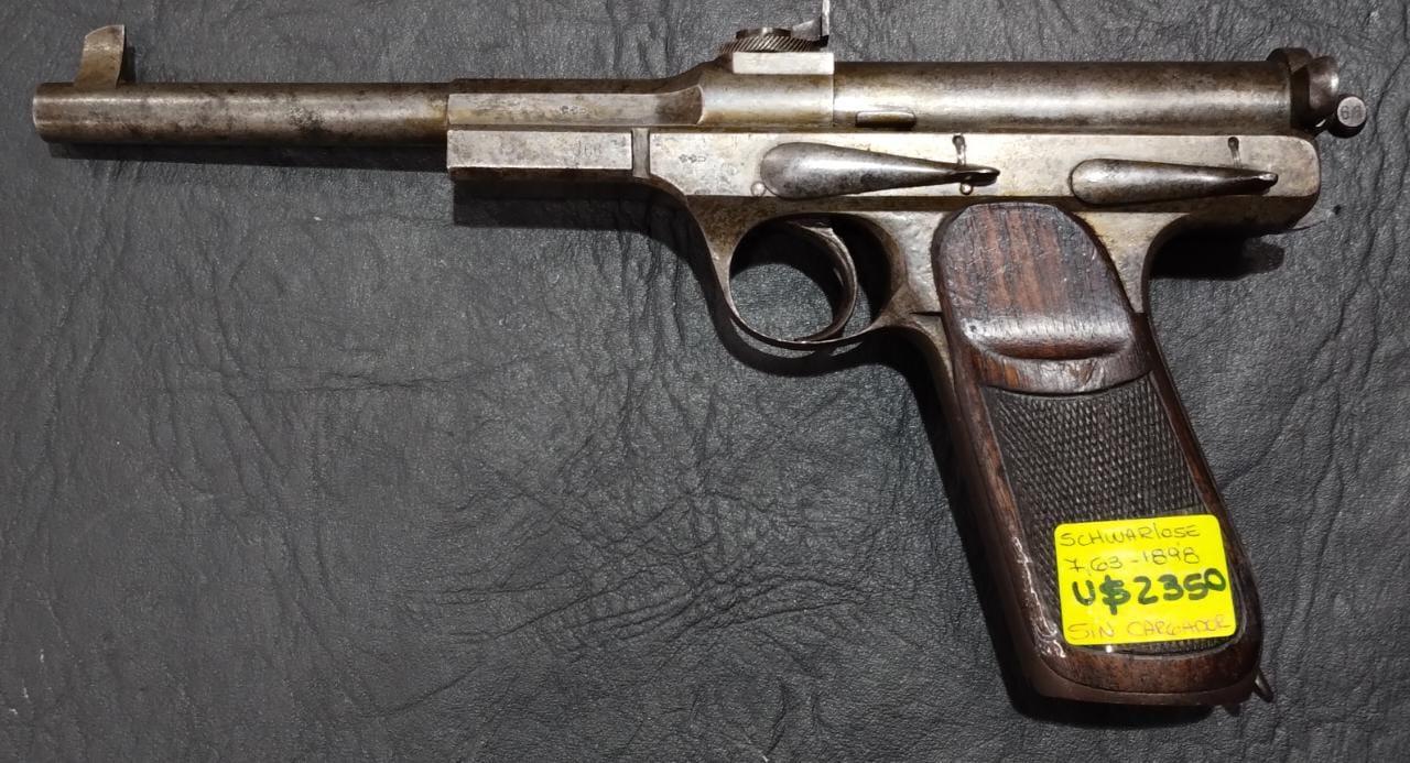 Pistola semiautomatica marca Schwarzlose mod 1898 calibre 7,63 sistema de acerrojamiento rotativo alza regulable, en estado original con cachas de nogal, no posee cargador.- Excelente y rara pieza de colección